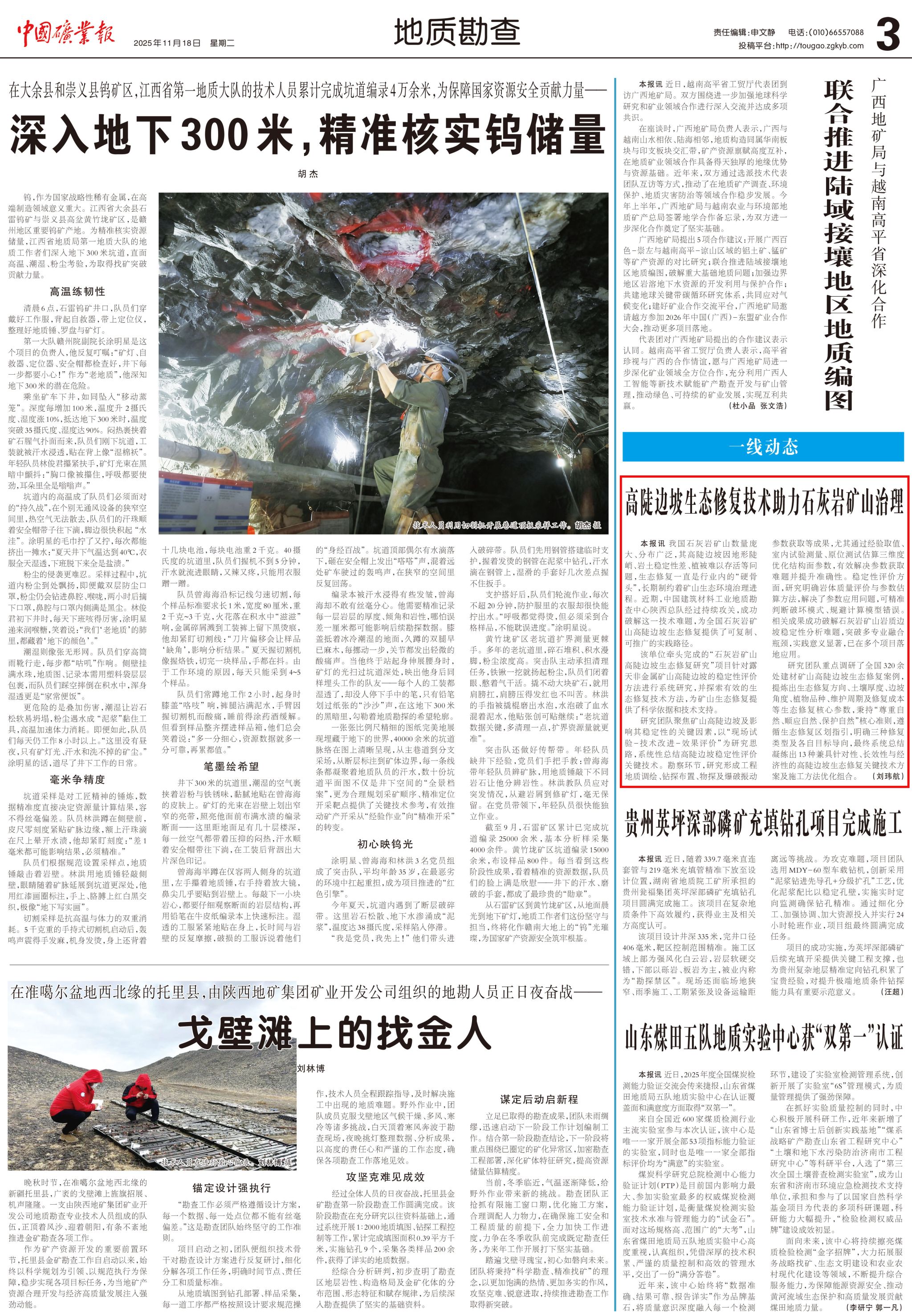 11月18日,一篇名为《高陡边坡生态修复技术助力石灰岩矿山治理》的新闻在《中国矿业报》地质勘查版面刊发。其聚焦了中国建筑材料工业地质勘查中心陕西总队在矿山生态修复领域的重要技术突破,彰显了总队的专业实力与责任担当。