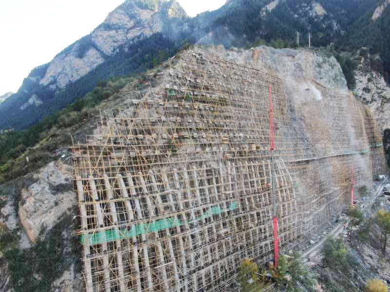 该项目核心任务是对90—140米高、近乎直立的国道公路高陡岩质边坡实施加固治理,施工难点尤为突出:一是施工工艺复杂、工期高度紧张,主要采用“危岩清理 + 主动防护网 + 锚索 + 混凝土竖肋 + 凹腔嵌补”综合技术手段,需在210天内完成锚索、主动防护网、混凝土竖肋、危岩清理、独立锚墩等主体工程,对技术能力、组织协调、施工效率及应急措施均提出极限要求;二是作业难度大、风险高,施工需在双向通车的约8米宽运营国道上,占道半幅搭设近90米高、300米长的近乎垂直的双排脚手架,且要保障正常交通通行,后续锚索、竖肋等工序均需在脚手架上交叉开展,属于危大工程中超高难度、超高风险的作业类型。因此,如何在保障安全的前提下顺利按期完工,成为对总队及项目部的严峻考验。