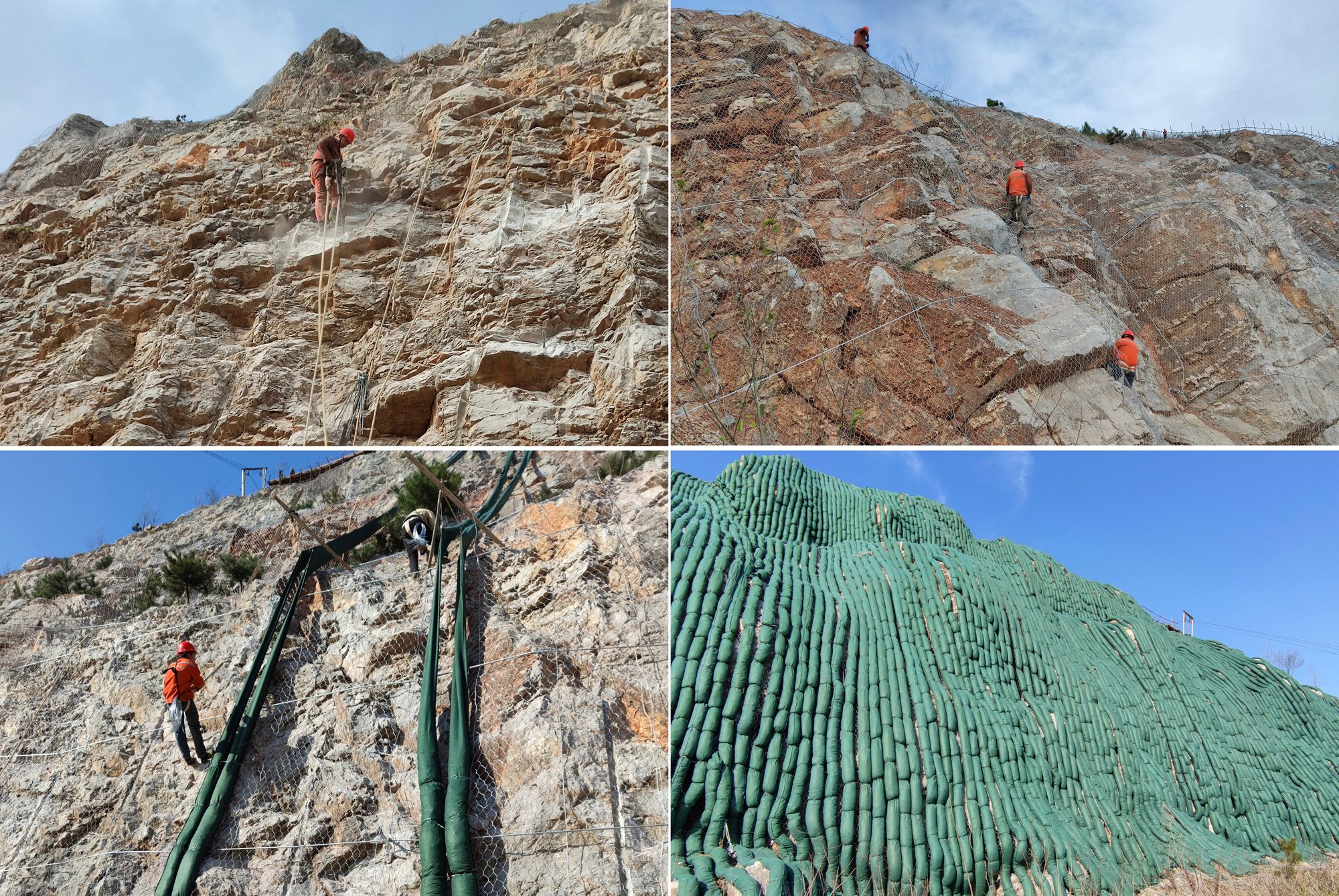 该生态治理工程针对矿山不同区域地形特点实施精准治理,破解了多类生态修复难题。高陡立面(A区)通过危岩清理、双重结构防护、生态长袋绿化等系列工序,搭配专属自动化喷-滴灌系统及常态化养护,成功攻克高陡岩质边坡复绿难题,如今陡峭岩壁已实现稳定植被覆盖。底部平场地(B区)采用“分区多层覆土+立体绿化”模式,平台划分精细,种植乔、灌、草形成复合型林地生态系统,植被存活率保持在95%以上。两侧边坡(C区)以弃渣造坡为基础,通过植生袋筑牢绿化根基,经过两年人工养护与自然生长,已实现生态功能与景观效果的双重提升。