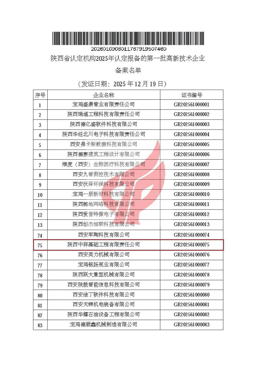 近日,陕西总队所属陕西中祥基础工程有限责任公司凭借深厚的技术积累、持续的创新能力和规范的研发管理,顺利通过国家级高新技术企业再认定。